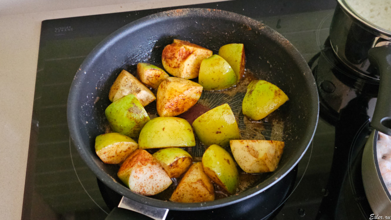 Для фарширования взял зеленые яблоки, разрезал их и обжарил в достаточном количестве сливочного масла. Яблоки поперчил черным перцем, сладким красным перцем и острой паприкой.