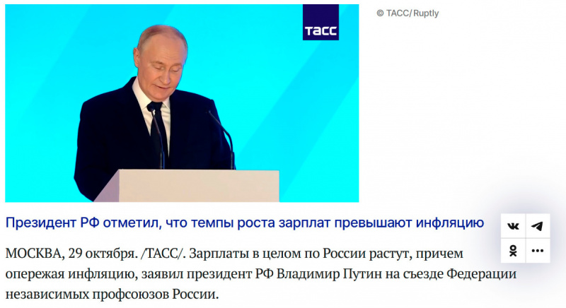 В конце октября Путин заявил, что зарплаты в целом по России растут, причем опережая инфляцию. Ну, где-нибудь в военном производстве они, наверное, и растут. А для понимания того, что вообще происходит во многих других отраслях, можно послушать вот этот рассказ работника "Автоваза", которому осталось несколько месяцев до пенсии. (Осторожно, в видео содержатся энергичные выражения - рабочий ведь.)