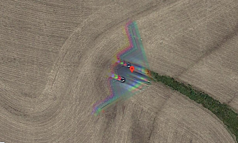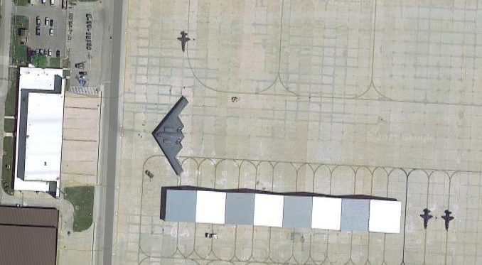 На карте Гугла вот здесь в Миссури обнаружен stealth-бомбардировщик Northrop B-2 Spirit. Насколько я помню, это самый дорогой самолет в истории авиации - в районе $4 миллиардов он стоит.