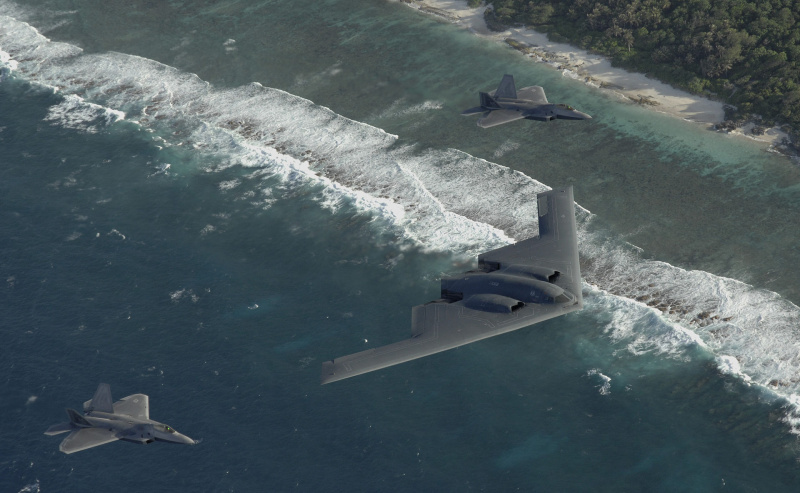 Two F-22 Raptors and a B-2 Spirit bomber deployed to Andersen Air Force Base, Guam, fly in formation over the Pacific Ocean. The deployment to Andersen marks the first time F-22s and B-2s, the key strategic stealth assets in the Air Force inventory, deployed together outside the continental United States.