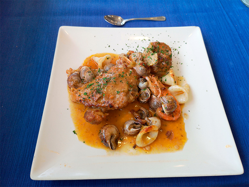 Каталаны - такие затейники. Семейный ресторанчик, меню дня (menú del día). Блюдо: курица, улитки, кальмары, креветки. В этом блюде не хватает кролика, лобстера, риса и творожной запеканки.