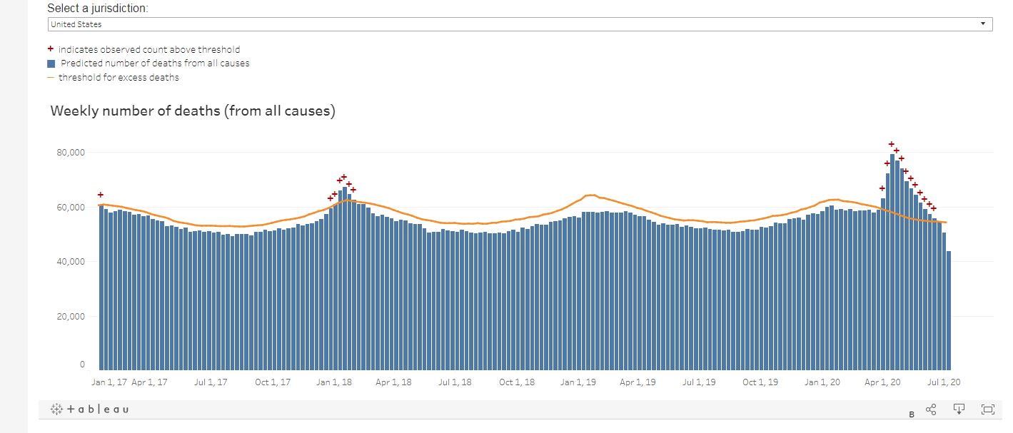 На самом деле, во-первых, эпидемия в США закончилась, вот график excess deaths (который, кстати, подтверждает тот тезис, что уханьский вирус забрал многих из тех, кому и так осталось жить пару месяцев):