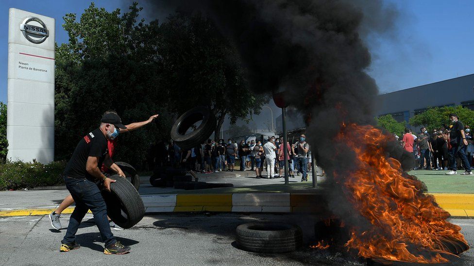 Сегодня в Барселоне начались волнения среди уволенных сотрудников завода. Они подожгли шины перед въездом на территорию завода.