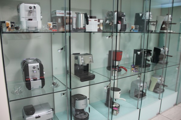 В административном здании завода Saeco на весь этаж идут стенды с кофемашинами - выглядит это очень эффектно.