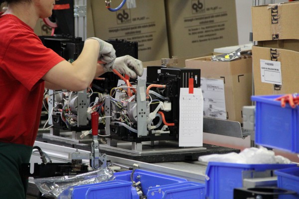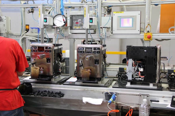 Кофемашины собираются конвейрным способом: конвейр, где на каждом участке работник выполняет какую-то простую операцию.
