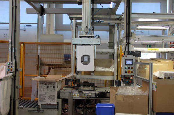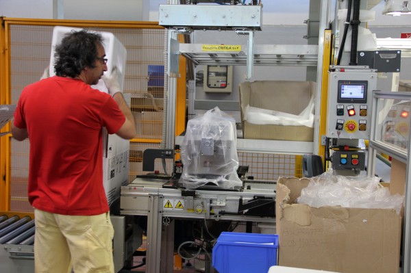 В конце конвейра - единственный мужчина, работающий на упаковочном аппарате. Ему надо только подносить пенопласт из коробки, остальное аппарат делает сам.