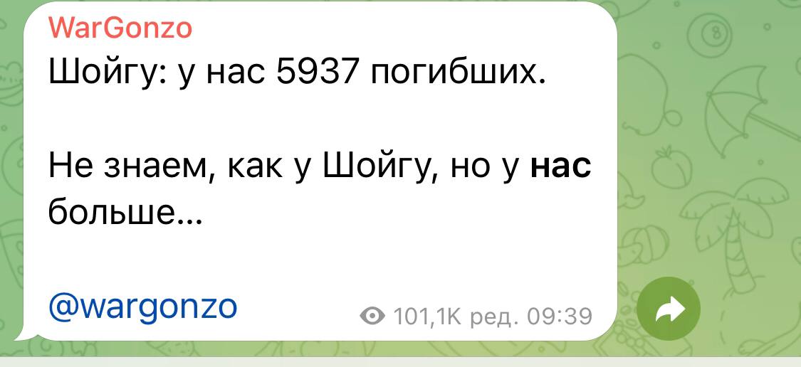 Про потери ВСУ более 100 тысяч и потери РФ в количестве 5937 человек - было вот прям очень смешно.