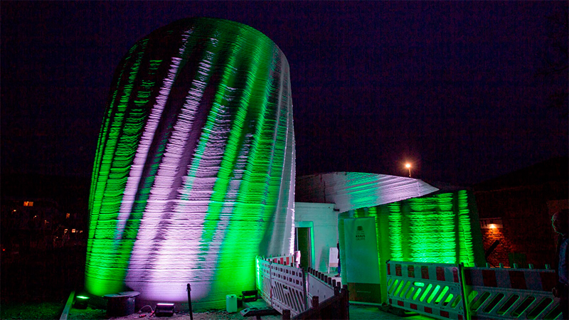 Здание имеет площадь 600 квадратных метров, и его стены возводились со скоростью 4 кв. м в час. На возведение всего здания потребовалось 140 часов. Строились стены с помощью принтера BOD2 от COBOD International.