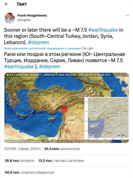 Передавайте от меня слова сочувствия вашему клиенту. А вообще, я не ожидал узнать так много о прогнозировании землетрясений, о землетрясениях конкретно в Турции, в Америке... Даже научную статью приложили с расчетами и цифрами. Вот уж действительно никогда не знаешь, где найдешь, где потеряешь. Для полноты картины не хватает только Пафнутия, который бы выскочил, как домовенок Кузя из коробочки, и, грозно насупив брови, показал бы нам всем "Кузькину мать". В любом случае спасибо всем, кто присоединился к обсуждению и объяснил мне, как устроено прогнозирование землетрясений.