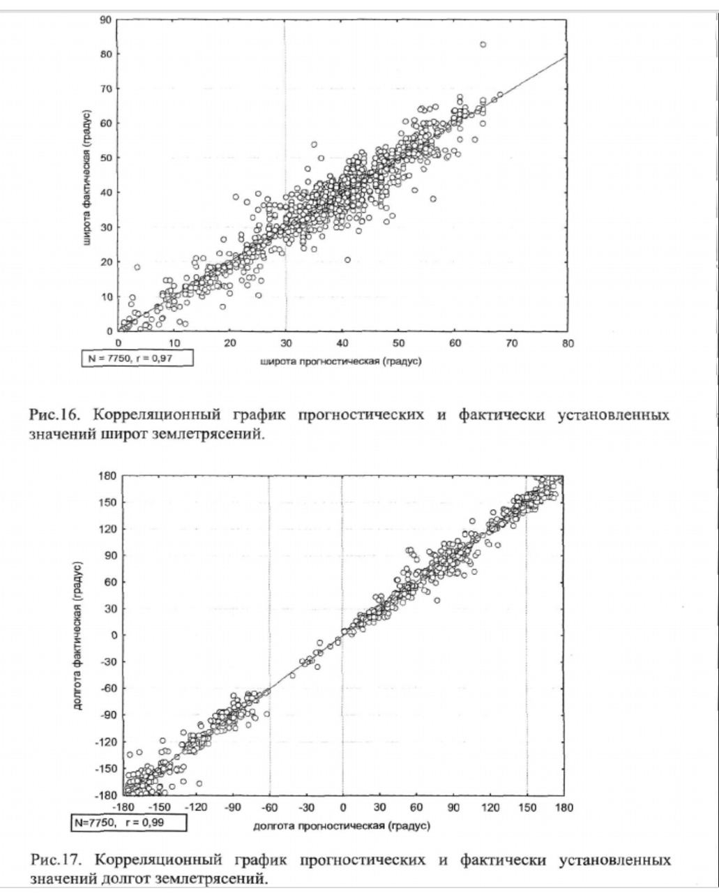 Для конкретного того метода (страница 42 автореферата той доктороской например) - там описаны как раз оценки точности для примерно 10 000 событий, предсказанными посчитали примерно 7500, интервалы по широте/долготе и времени. Для большей части событий отклонение менее 1 градуса (220км) для эпицентра, по времени - большая часть в тот же день (свершившимися считаются разброс в +- 13 часов), со сроком оценки за 48 часов до. Ну и далее объяснения от чего зависит точность и как ее повысить итп.