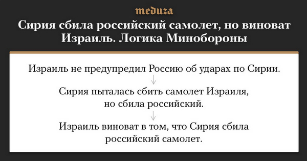 "Израиль выражает сожаление о гибели экипажа российского самолета, сбитого сегодня ночью в результате огня сирийской ПВО, возлагает полную ответственность за инцидент на режим Асада, чья армия сбила российский самолет, и рассматривает Иран и организацию Хизбалла также несущими ответственность за этот печальный инцидент.
