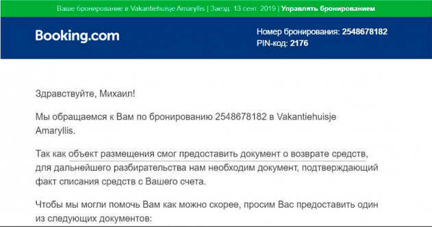 Ну мы отправили им выписку из нашего банка. И знаете, что ответила служба поддержки Booking.com? Цитирую: «Мы полагаем, что Вы получите более быстрый и точный ответ, если свяжетесь с объектом размещения». Нормально, да?
