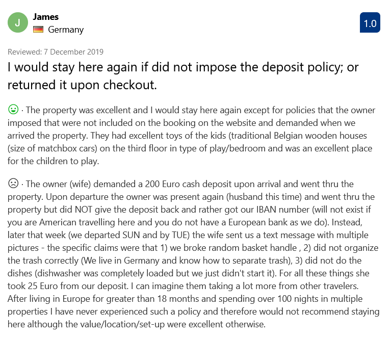 Хозяйка этого дома в Брюгге использует новую схему мошенничества. По официально опубликованным условиям бронирования, при заезде с гостей берут залог 200 евро наличными (но не дают ни расписок, или чеков). Залог обещают вернуть на банковскую карту в течение недели после выезда. Потом хозяйка дома как бы отправляет деньги на Ваш карточный счет, но – внимание! – делает ошибку в реквизитах. Через пару недель деньги, не найдя адресата, возвращаются к ней за минусом небольшого банковского процента. Зато у хозяйки есть от её банка как бы «чек» - бумажка, которую она предъявляет Вам и Booking.com