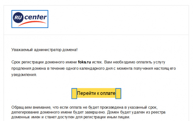 Пришло письмо. Якобы от RU CENTER. Домен действительно мой, срок действительно истекал бы завтра, если бы не был оплачен еще на год вперед. Ссылка на "Перейти к оплате" сразу свидетельствует о том, что это жулье. На всякий случай заглянул в служебные строки - адрес ожидаемо подделан.