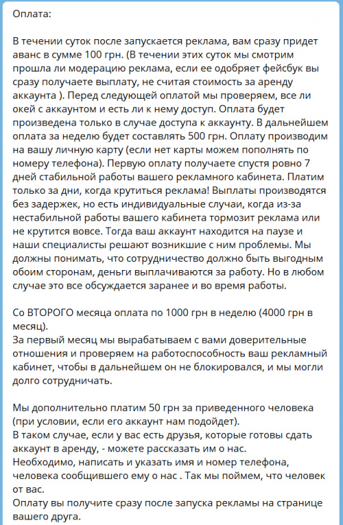 Не знаю насчёт этих товарищей, но так то это распространенная штука. Реально арбитражники арендуют аккаунты честно. Но часто даже месяца он не живёт. Так что оплату больше чем на месяц ждать не стоит. Но бывает что и 2 и 3 месяца живёт. И при бане рекламного аккаунта основной профиль не банится и живёт как и жил раньше.