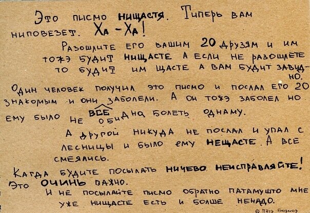 Вспомнил, что ещё в СССР рассылали аналоговые письма, которые надо было переписать энное количество раз и разослать разным людям. Там было веселее. Там надо было не письма, а открытки пересылать. У меня знакомый с этим развлекался, получил кучу открыток со всех концов света 😄