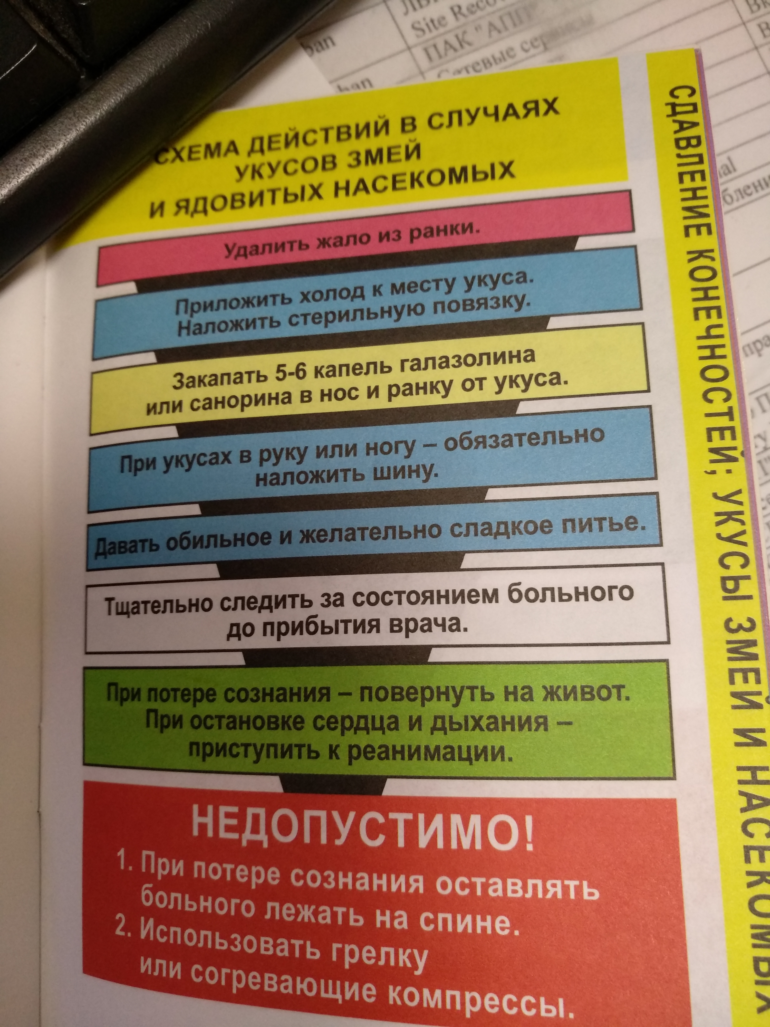 У сотрудника МЧС, когда он на работе в лесу в летнее время, должен быть с собой шприц с сывороткой. Ну и приспособление для отсасывания яда.