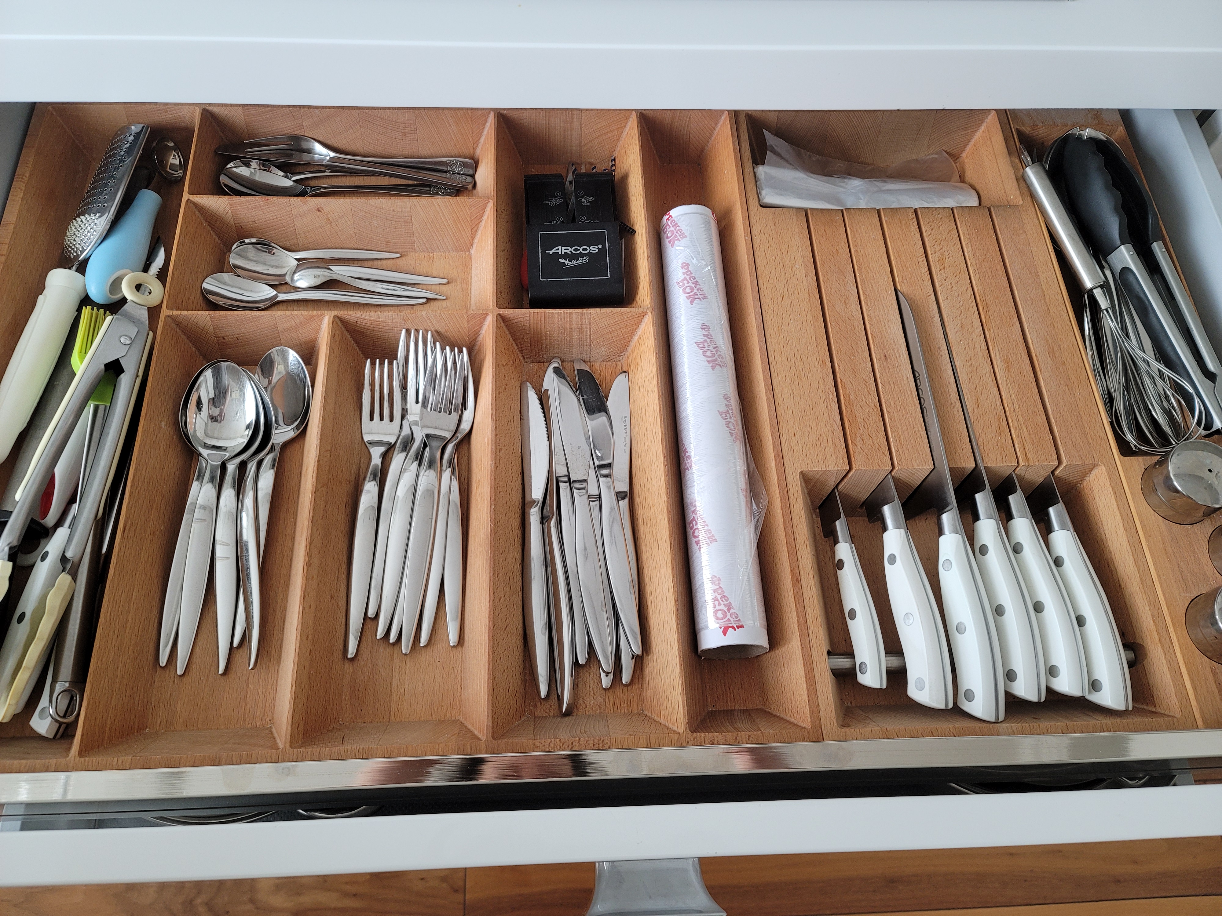 У нас в доме приборы всегда разложены так - если слева направо: ножи, вилки, большие ложки, маленькие ложки. И всегда именно в таком порядке - и в московских квартирах, в которых мы жили, и в испанских.