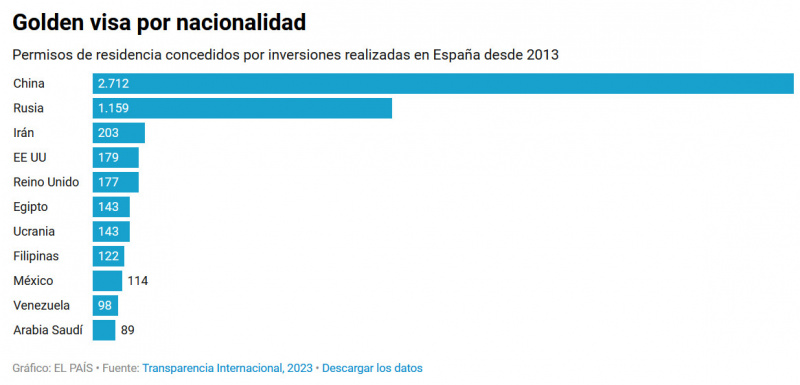 В докладе Transparency International, опубликованном в прошлом году, отмечается, что основными бенефициарами визовых грантов в Испании являются граждане Китая и России. С 2013 года Испания выдала китайским инвесторам 2 712 виз, из которых 99,33 % были выданы под приобретение недвижимости; в то время как инвесторам российского гражданства было выдано в общей сложности 1 159 виз, из которых 94,65 % были выданы под покупку жилья. Далее следуют иранские инвесторы - 203 визы, 99,01% которых были выданы на основании приобретения недвижимости; инвесторы из США, которым было выдано в общей сложности 179 виз (94,97% на покупку жилья) и инвесторы из Великобритании, которым было выдано 177 виз (93,78% на покупку жилья). В список государств, которым Испания выдает наибольшее количество виз, хотя и в меньшей пропорции, по-прежнему входят: Египет (143 визы), Украина (143 визы), Филиппины (122 визы), Мексика (114 виз), Венесуэла (98 виз) и Саудовская Аравия (89 виз).