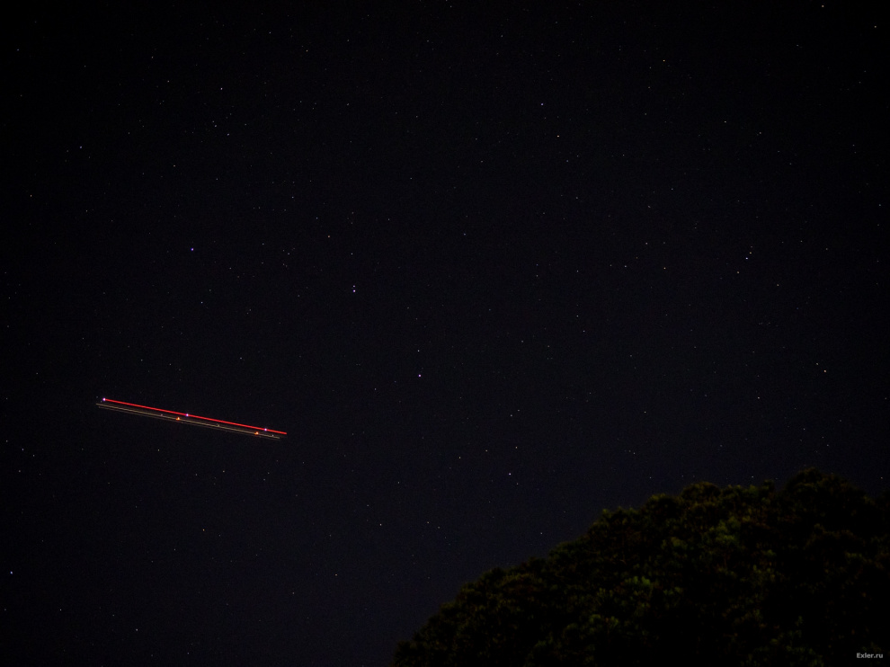 Поснимал звездное небо, но с такой засветкой ничего хорошего не получилось. Вот разве что забавный кадр, когда мимо пролетал самолет.