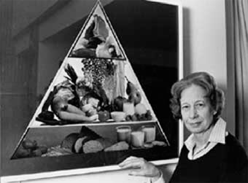 В 1992 году свою пищевую пирамиду разработало Министерство сельского хозяйства США. Она демонстрировала пропорциональность и разнообразие в каждой из пяти групп продуктов и напитков, которые также располагались горизонтальными слоями, начиная от основания и двигаясь вверх к вершине: хлеб, крупы, макароны и рис; фрукты и овощи; молочные продукты; яйца, рыба, бобовые, мясо и птица; а также алкоголь, жиры и сахар.