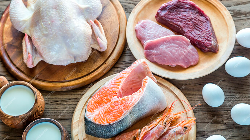 Продукты, богатые белком: мясо, яйца, рыба, морепродукты, бобовые, творог, сыры, орехи.