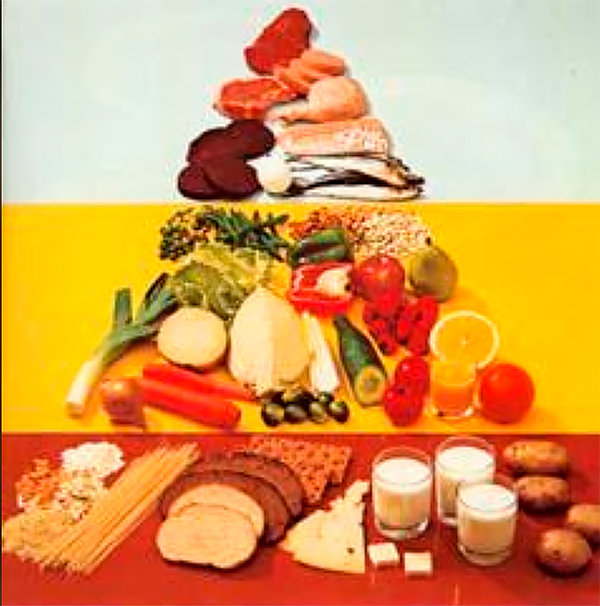 Схематично это изображали как-то так: в основе питания - хлеб, макароны, рис, фасоль, картошка, сыры, немного масла, молоко. Далее идут всякие овощи и фрукты, и в самой вершине пирамиды - мясо и рыба.
