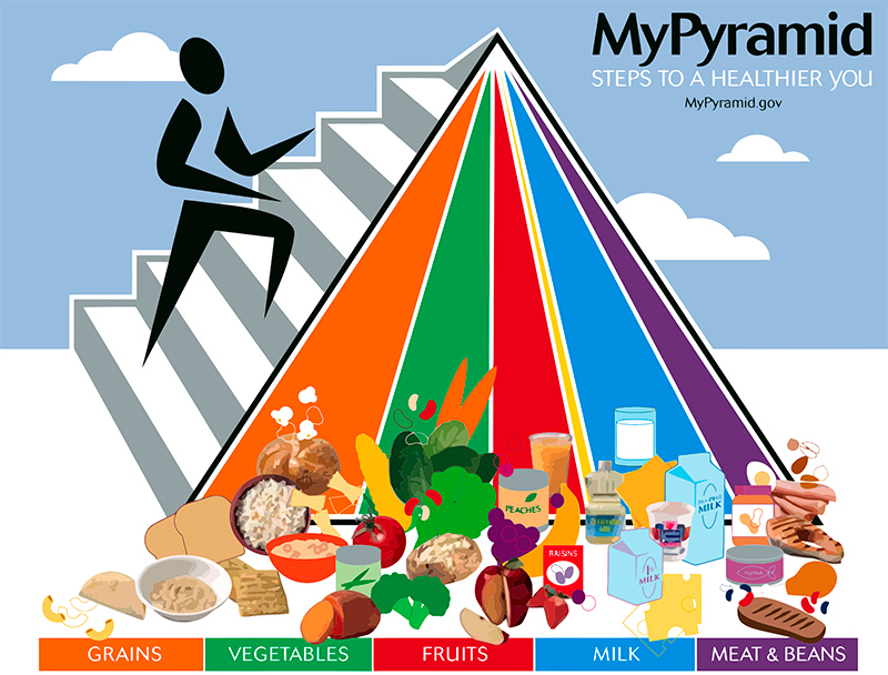 В 2005 году Министерство сельского хозяйства США представило MyPyramid, обновленную версию Пирамиды пищевого руководства. Группы продуктов питания были изображены в виде восходящих вертикальных полос, которые подчеркивали правильные пропорции групп продуктов. Изображение человека, поднимающегося по лестнице, обрамляло пирамиду, чтобы подчеркнуть необходимость физической активности. Вместо порций количество продуктов тут измеряется в чашках и унциях.