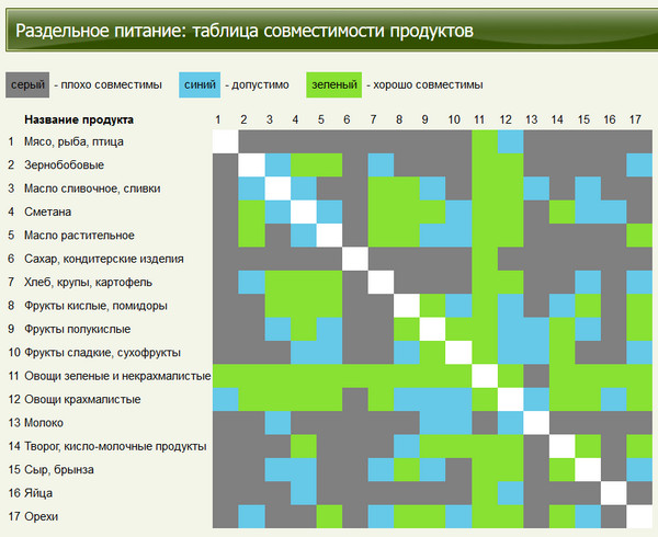 И так как доктор Шелтон хотел помогать всем людям, даже идиотам (тем более что за это хорошо платили), он разработал систему раздельного питания, где четко расписал, что с чем можно, а что нельзя. Он составил "таблицу совместимости продуктов", основанную на тщательных результатах анализа своего воспаленного воображения, ну и дальше по этой таблице можно было конструировать самые разнообразные диеты, чем и по сей день занимаются многочисленные последователи этой системы.