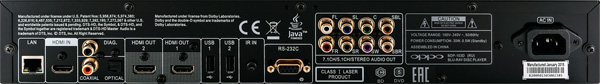Итак, слева направо: порт Ethernet, вход HDMI, специальный видеовыход для диагностики, коаксиальный аудиовыход, оптический аудиовыход, выход HDMI1 (поддержка 3D и специальных технологий обработки видеосигнала - об этом подробнее ниже), выход HDMI2 (поддержка 3D), два USB 2.0, вход для внешнего ИК-порта, порт RS-232C, аудиовыходы 7.1CH/5.1CH/стерео, вход адаптера питания.