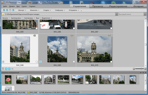 Главная из всего этого многообразия программ для домашних пользователей - это, конечно, ACDSee Photo Manager. В принципе, кроме нее, ничего особо-то и не нужно, потому что с ее помощью можно создавать и вести библиотеки изображений, в удобном виде просматривать изображения, обрабатывать и редактировать как группы изображений, так и отдельные фотографии. Собственно, я ею всегда и пользовался, пока не перешел на Vista.