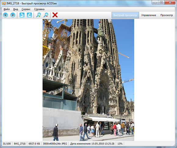 Если щелкнуть по просматриваемому изображению, то ACDSee переключается в режим "Управление", то есть вызывает основное окно. В новой версии у быстрого просмотра справа появились закладки "Управление" и "Просмотр", чтобы в эти режимы просмотра можно было переключаться одним щелчком мыши.