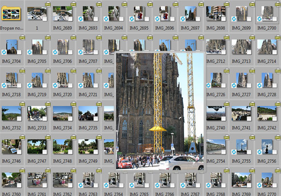 Там есть очень удобный режим - раскадровка. Это когда снизу идут иконки предпросмотра ближайших фотографий, а сверху - текущее изображение.