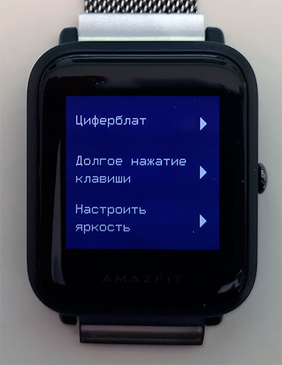 Настройки. Здесь можно менять циферблат, назначать действие на длинное нажатие управляющей клавиши.