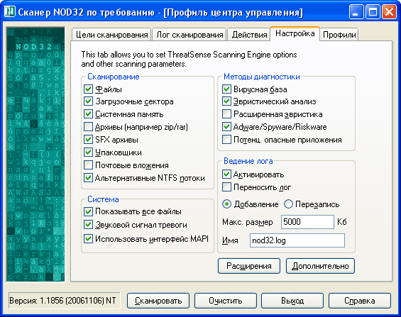 В правом окне показаны основные настройки, а если нажать кнопку ниже, появится возможность задать некоторые весьма интересные параметры NOD32.