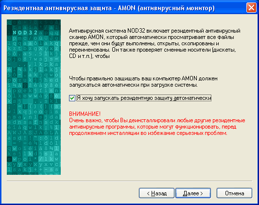 Во время инсталляции NOD32 прописывает свой вызов в параметры загрузки операционной системы. Загруженный NOD32 показывает свой значок в системной области уведомлений, и после щелчка по значку открывается окно центра управления антивируса: