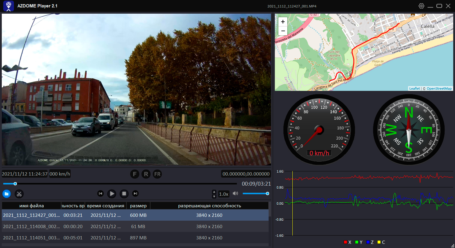 GPS здесь установлен не только для того, чтобы записывать координаты прямо на видео. Вы можете с сайта разработчика скачать приложение AZDOME GPS Player, которое есть и под Windows, и под Mac, и там в удобной форме по треку вам будут выводить всевозможную информацию: направление движения, скорость, работа G-сенсора, трекинг маршрута.