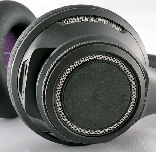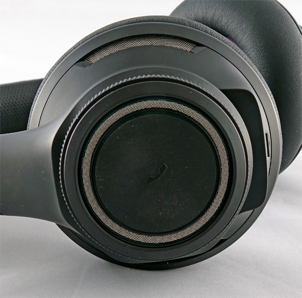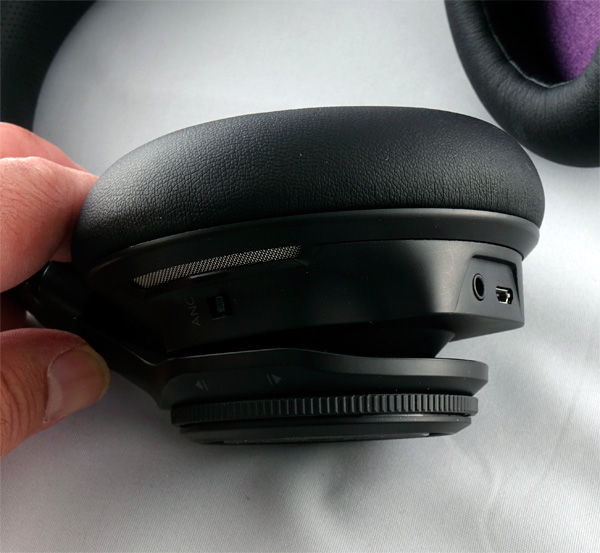 На левой амбушюре: кнопка включения шумоподавления, вход microUSB (для зарядки), выход 3,5 мм для провода гарнитуры, кольцо перемещения по трекам (вперед и назад), кнопка играть/пауза.