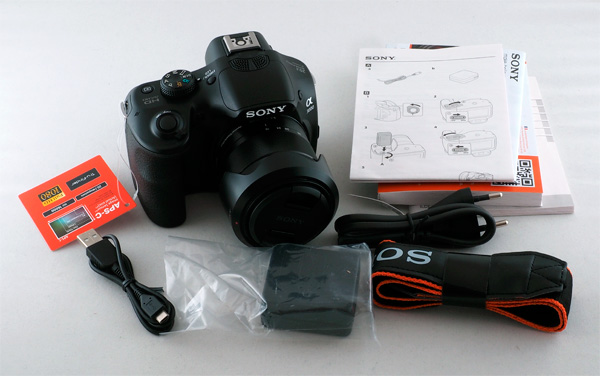 Комплектация простенькая: камера, китовый объектив, бленда, адаптер питания с кабелем USB-microUSB, наплечный ремень, брошюрки.
