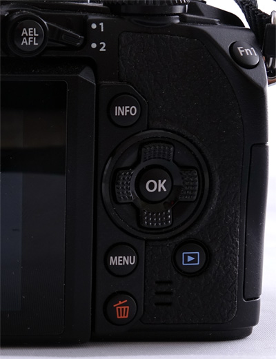 Ниже - кнопка Info, переключающая отображение данных на экране. Далее четырехпозиционный джойстик с центральной кнопкой "ОК" (джойстик по умолчанию перемещает "прицел" фокусировки), кнопки "Меню", "Просмотр" и "Корзина".