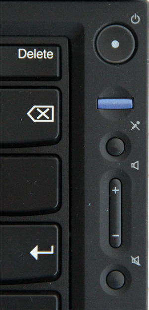 В правой верхней части корпуса - кнопка питания, скроллер-кнопка, вызывающая фирменную утилиту ThinkVantage (вот на черта ее вызов сажать аж на отдельную кнопку?), кнопка включения/выключения микрофона, регулировка громкости, включение/выключение звука.