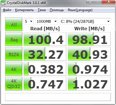 Теперь давайте посмотрим быстродействие жесткого диска по CrystalDiskMark.