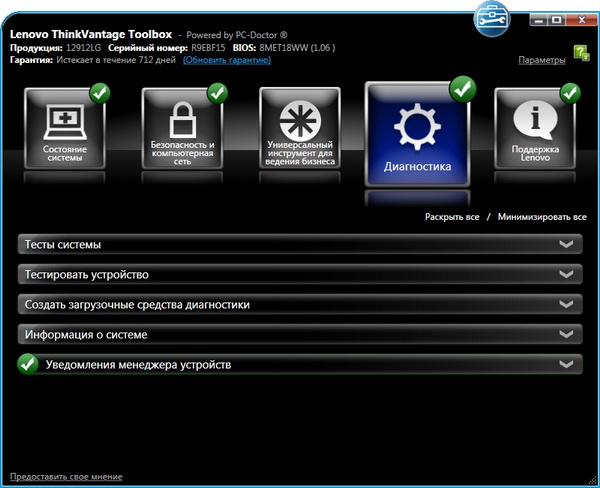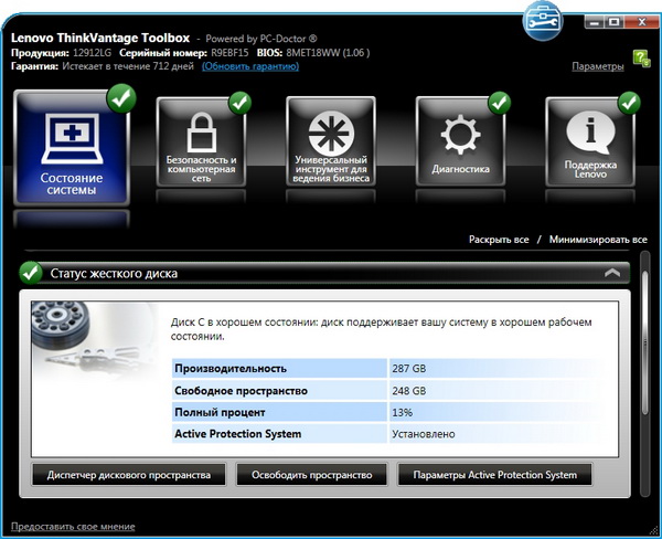 Раздел "Состояние системы". Резервное копирование и восстановление, состояние жесткого диска, батареи, производительности, обновления, проверка аппаратных средств.