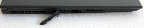Левый торец - вентиляционная решетка, откуда выходит горячий воздух, далее под заглушкой - выход для наушников (гарнитуры), порт USB. Кстати, не очень понятно, на черта там заглушка - если постоянно пользуешься портом USB и/или наушниками, заглушку так и тянет оторвать.