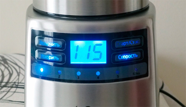 Кнопка "Старт/стоп" запускает и останавливает устройство. На дисплее указывается остающееся количество секунд работы: на каждом из скоростных режимов по умолчанию устанавливается 120 секунд, по истечении которых блендер останавливается.