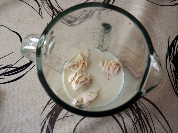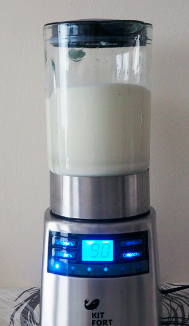 Ставим на первую скорость, через минуту открываем крышку и вливаем туда пол-литра холодного молока.
