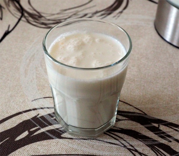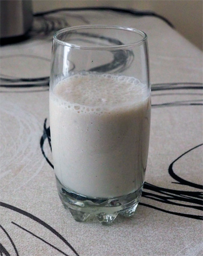 Через минуту - готово. Наливаем в бокал - ну точно, коктейль! Никакой не "смузи"! Попробовал - вкусно. После тестирования на себе позвал жену, предложил попробовать. Попробовала. Говорит - молочный коктейль с бананом и яблоком. Все в точку, зрит в корень!