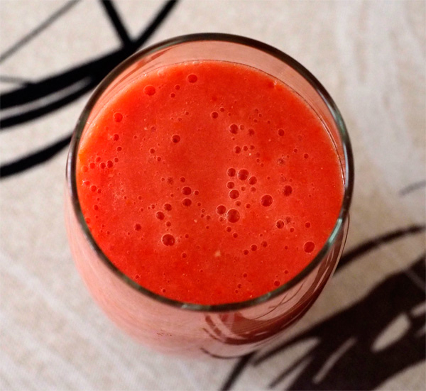 Получилось очень хорошо: однородная структура без каких-либо признаков частиц кожуры. Единственное - изредка попадались мелкие семечки, но я так понимаю, что ни один из домашних блендеров с помидорными семечками не справится. Да и зачем? Наоборот - они придают фрешу некоторую пикантность, даже я бы сказал - фривольность!