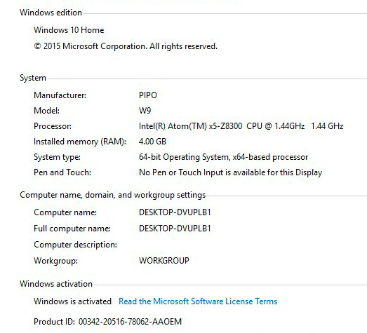 Ноутбук приехал с неактивированной Windows, и поначалу она отказывалась активироваться и даже выдавала сообщение на десктопе об отсутствии активации: я уже было подумал, что система здесь нелицензионная, что плохо. Однако буквально на следующий день использования надпись пропала сама собой, я заглянул в System: нет, нормально активировалась, все в порядке.