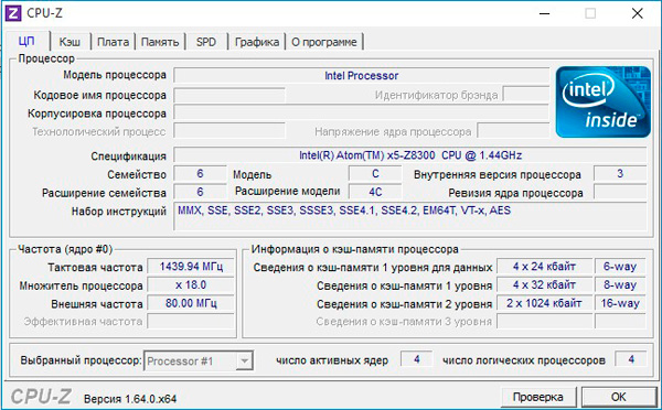Процессор: Intel Cherry Trail Z8300, Quad Core 1.44GHz